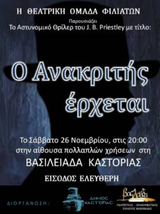 Ο Δήμος Καστοριάς και ο Πολιτιστικός Σύλλογος Βασιλειάδας προσκαλούν το θεατρόφιλο κοινό να παρακολουθήσει την παράσταση «Ο Ανακριτής Έρχεται» του Τζων Πρίσλεϋ από την Θεατρική Ομάδα Φιλιατών. Η παράσταση θα παρουσιαστεί στην αίθουσα πολλαπλών χρήσεων Βασιλειάδας το Σάββατο 26 Νοεμβρίου 2022, στις 20:00 και η είσοδος για το κοινό είναι ελεύθερη.