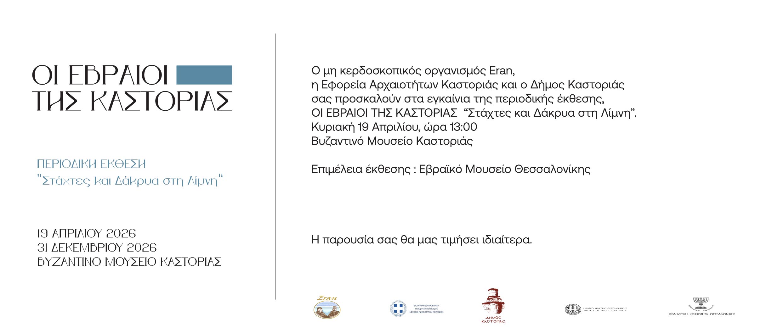 Ο μη κερδοσκοπικός οργανισμός ERAN, η Εφορεία Αρχαιοτήτων Καστοριάς και o Δήμος Καστοριάς σας προσκαλούν στα εγκαίνια της περιοδικής έκθεσης που θα πραγματοποιηθεί στο Βυζαντινό Μουσείο Καστοριάς, την Κυριακή 19 Απριλίου και ώρα 13:00 με τίτλο